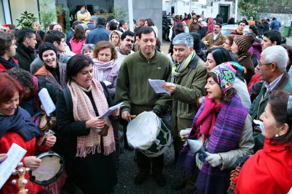 Ähnlich wie in übrigen Teilen Europas werden auch an seinem atlantischen Südwestrand, Weihnachtslieder bereits von Ende November an gesungen, seit der Renaissancezeit oft von einer Vielfalt an Instrumenten begleitet, beispielsweise die Viola braguesa, eine Gitarrenform, das der Ukulele ähnelnde Cavaquinho, Schlaginstrumente wie Ferrinhos, Tambor, Reco-Reco und der Adufe, eine viereckige Rahmentrommel aus der zentralen, von West nach Ost reichenden Beira-Region, der überwiegend von Frauen gespielt wird. In der Kirche werden allerdings die meisten Lieder eher a cappella, ohne Begleitung, aufgeführt.